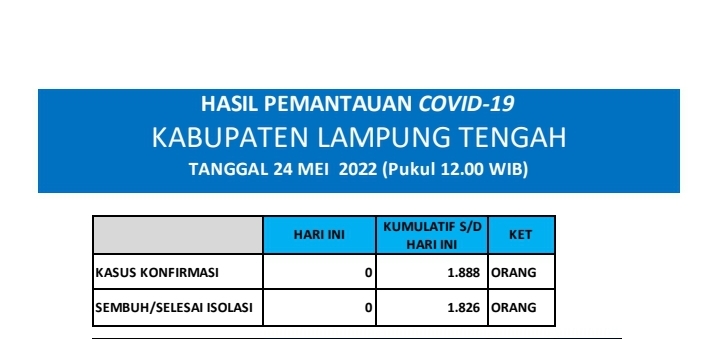 HASIL PEMANTAUAN COVID-19 KABUPATEN LAMPUNG TENGAH : Tanggal 24 Mei 2022