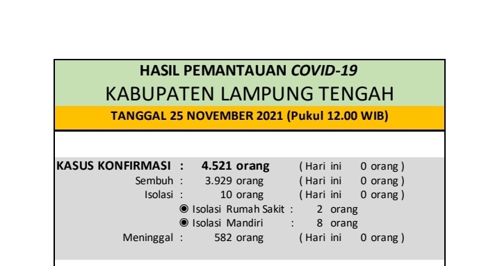 Download dokumen HASIL PEMANTAUAN COVID-19 KABUPATEN LAMPUNG TENGAH : Tanggal 25 November 2021 (Sampai dengan pukul 12.00 WIB)