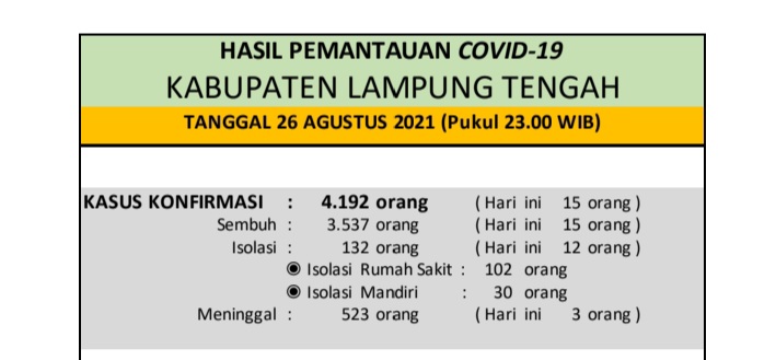 Download dokumen : HASIL PEMANTAUAN COVID-19 KABUPATEN LAMPUNG TENGAH : Tanggal 26 Agustus 2021 Pukul 23.00 WIB