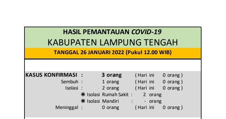 HASIL PEMANTAUAN COVID-19 KABUPATEN LAMPUNG TENGAH : Tanggal 26 Januari 2022