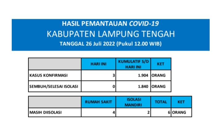 HASIL PEMANTAUAN COVID-19 KABUPATEN LAMPUNG TENGAH : Tanggal 26 Juli 2022