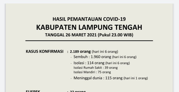 HASIL PEMANTAUAN COVID-19 KABUPATEN LAMPUNG TENGAH : Tanggal 26 Maret 2021 Pukul 23.00 WIB