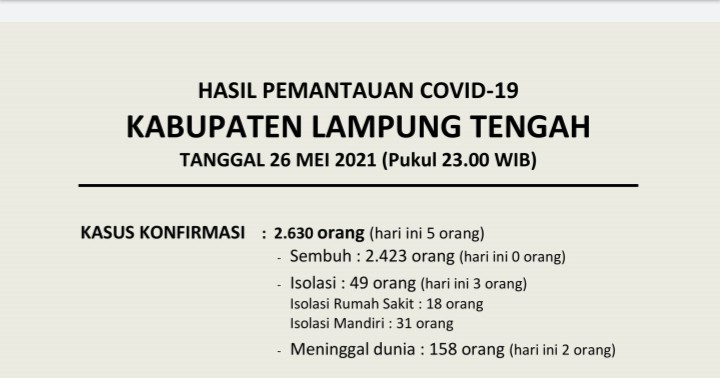 Download dokumen : HASIL PEMANTAUAN COVID-19 KABUPATEN LAMPUNG TENGAH : Tanggal 26 Mei 2021 Pukul 23.00 WIB