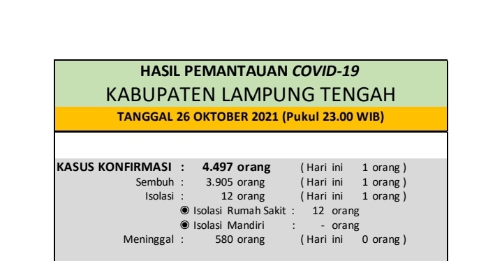 Download dokumen HASIL PEMANTAUAN COVID-19 KABUPATEN LAMPUNG TENGAH : Tanggal 26 Oktober 2021 Pukul 23.00 WIB