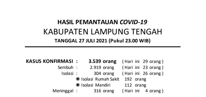 Download dokumen : HASIL PEMANTAUAN COVID-19 KABUPATEN LAMPUNG TENGAH : Tanggal 27 JULI 2021 Pukul 23.00 WIB