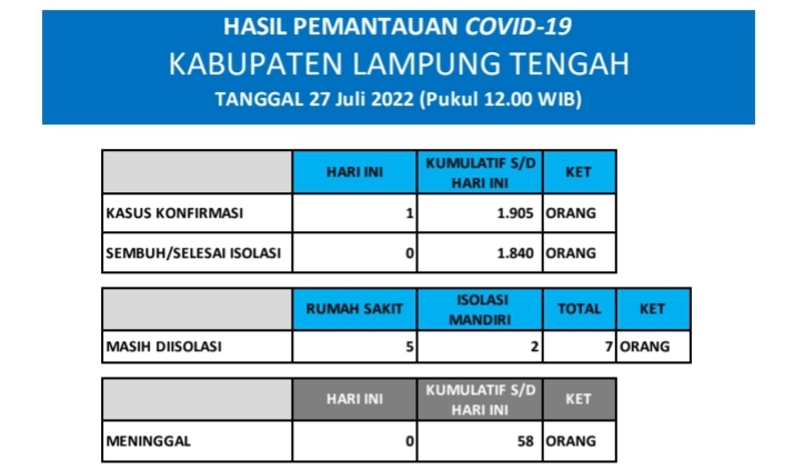 HASIL PEMANTAUAN COVID-19 KABUPATEN LAMPUNG TENGAH : Tanggal 27 Juli 2022