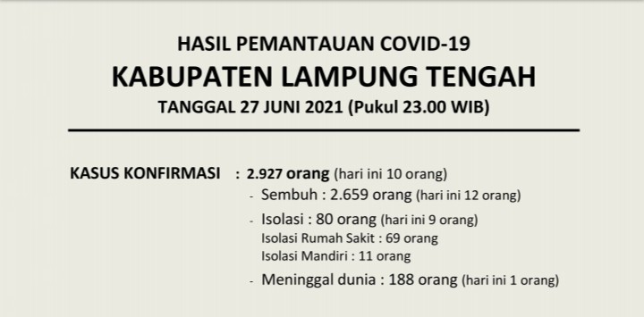 Download dokumen : HASIL PEMANTAUAN COVID-19 KABUPATEN LAMPUNG TENGAH : Tanggal 27 Juni 2021 Pukul 23.00 WIB