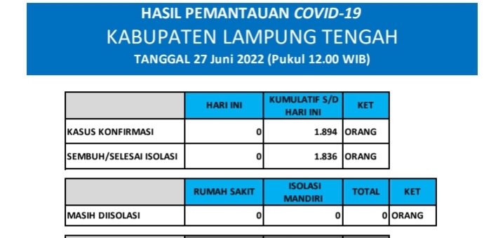 HASIL PEMANTAUAN COVID-19 KABUPATEN LAMPUNG TENGAH : Tanggal 27 Juni 2022