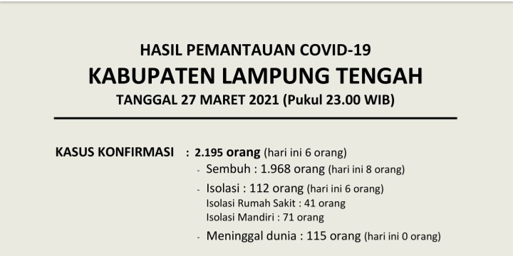 HASIL PEMANTAUAN COVID-19 KABUPATEN LAMPUNG TENGAH : Tanggal 27 Maret 2021 Pukul 23.00 WIB