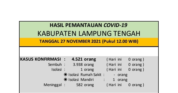 Download dokumen HASIL PEMANTAUAN COVID-19 KABUPATEN LAMPUNG TENGAH : Tanggal 27 November 2021 (Sampai dengan pukul 12.00 WIB)