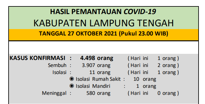 Download dokumen HASIL PEMANTAUAN COVID-19 KABUPATEN LAMPUNG TENGAH : Tanggal 27 Oktober 2021 Pukul 23.00 WIB