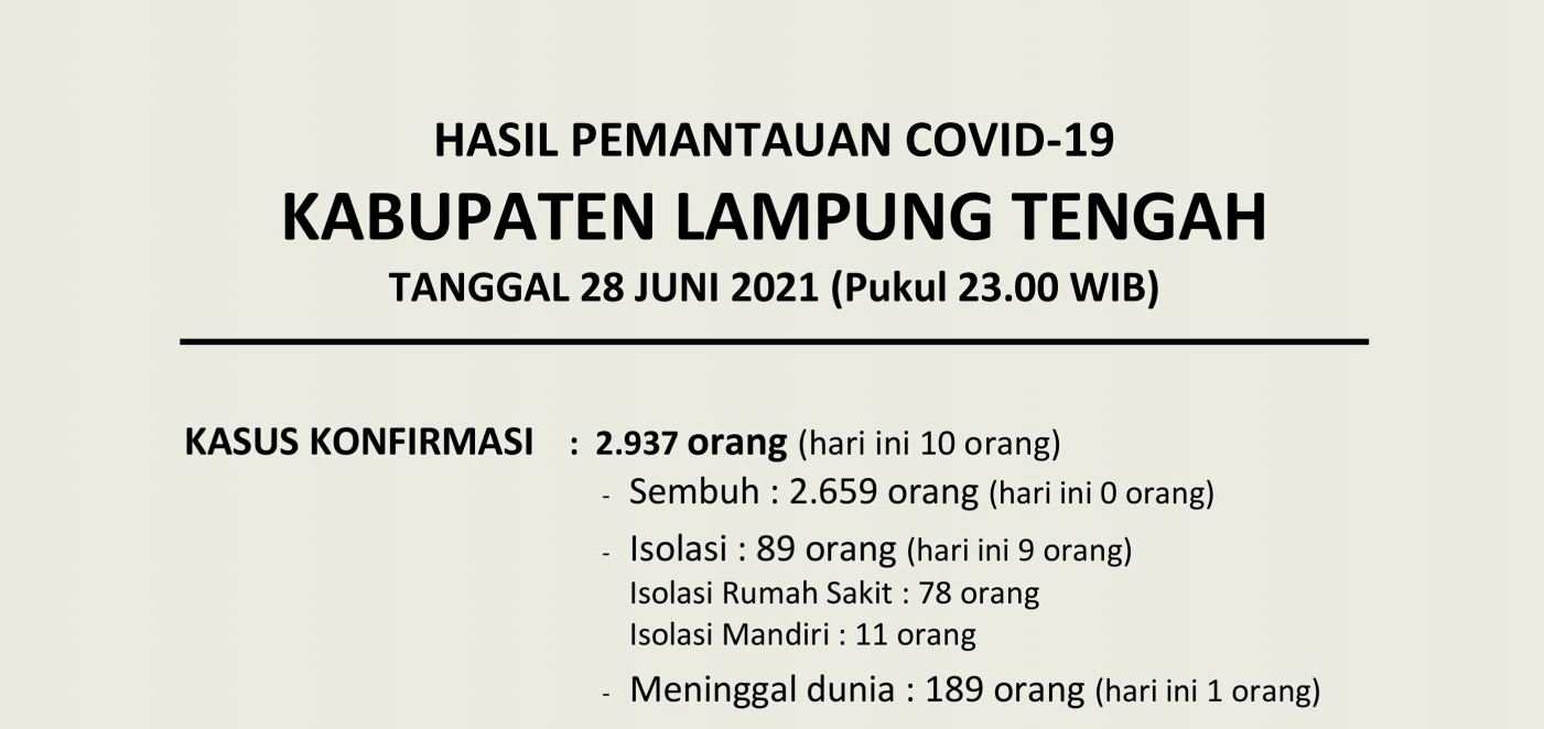 Download dokumen : HASIL PEMANTAUAN COVID-19 KABUPATEN LAMPUNG TENGAH : Tanggal 28 Juni 2021 Pukul 23.00 WIB