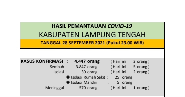 Download dokumen : HASIL PEMANTAUAN COVID-19 KABUPATEN LAMPUNG TENGAH : Tanggal 28 September 2021 Pukul 23.00 WIB