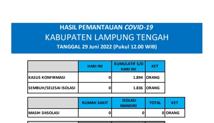HASIL PEMANTAUAN COVID-19 KABUPATEN LAMPUNG TENGAH : Tanggal 29 Juni 2022