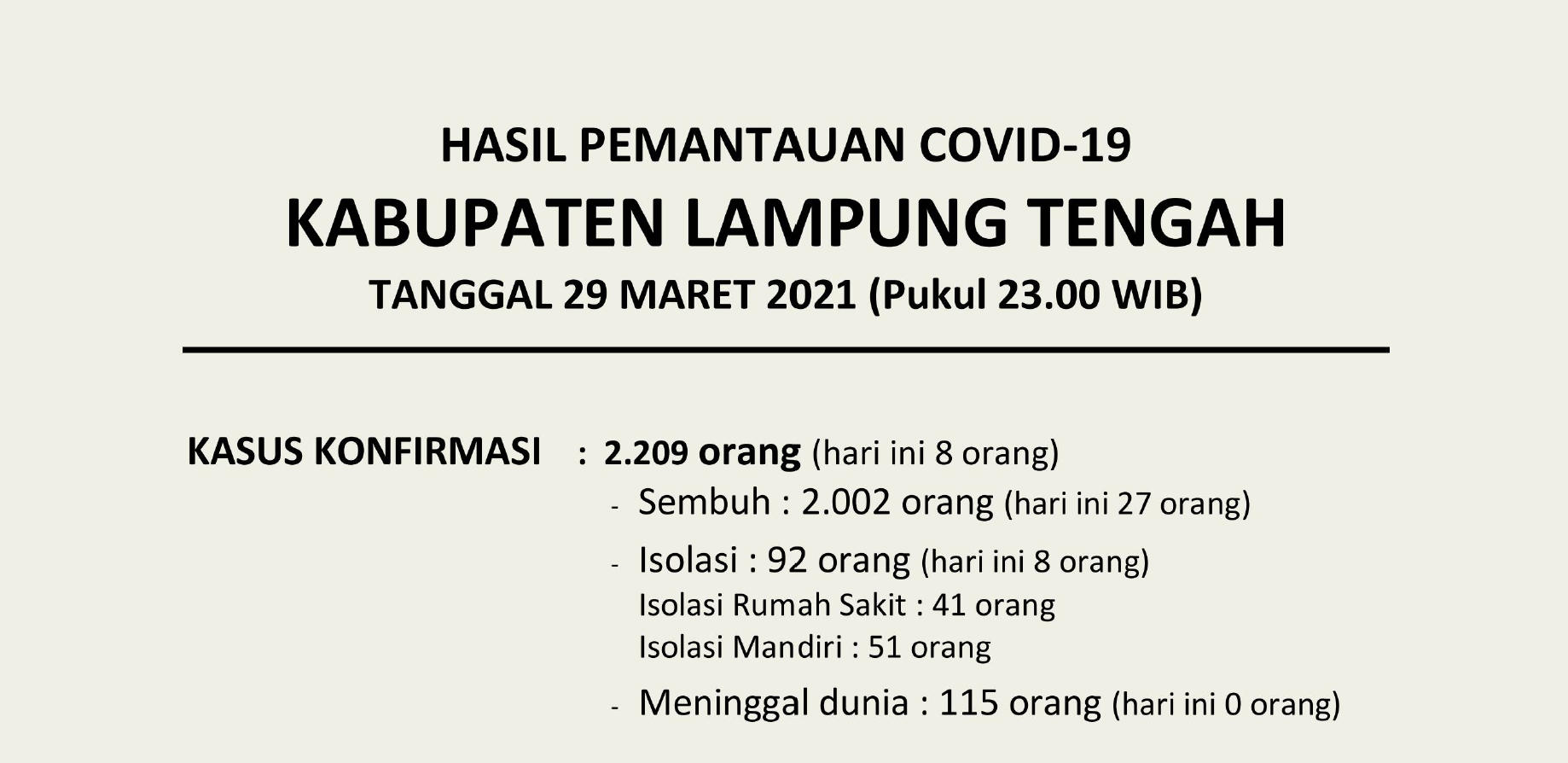 HASIL PEMANTAUAN COVID-19 KABUPATEN LAMPUNG TENGAH : Tanggal 29 Maret 2021 Pukul 23.00 WIB
