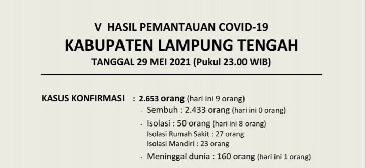 Download dokumen : HASIL PEMANTAUAN COVID-19 KABUPATEN LAMPUNG TENGAH : Tanggal 29 Mei 2021 Pukul 23.00 WIB