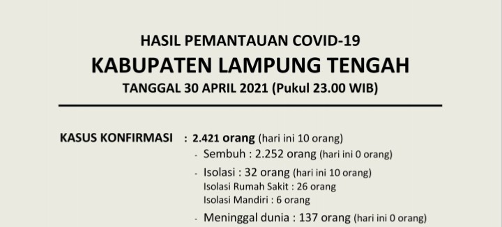 Download dokumen : HASIL PEMANTAUAN COVID-19 KABUPATEN LAMPUNG TENGAH : Tanggal 30 April 2021 Pukul 23.00 WIB