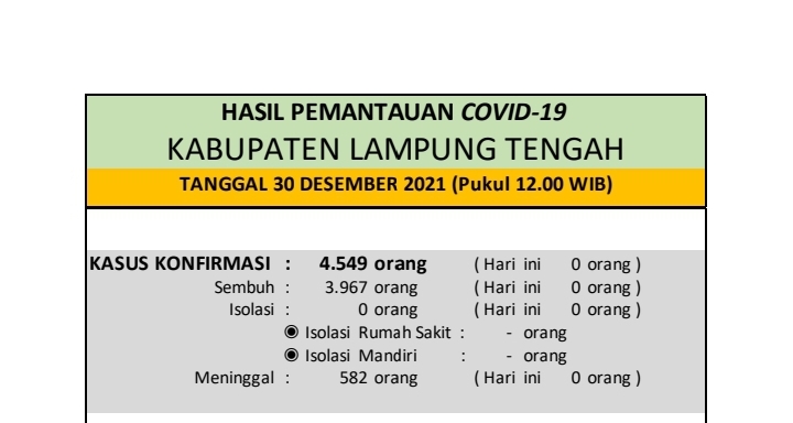 HASIL PEMANTAUAN COVID-19 KABUPATEN LAMPUNG TENGAH : Tanggal 30 Desember 2021 (Sampai dengan pukul 12.00 WIB)