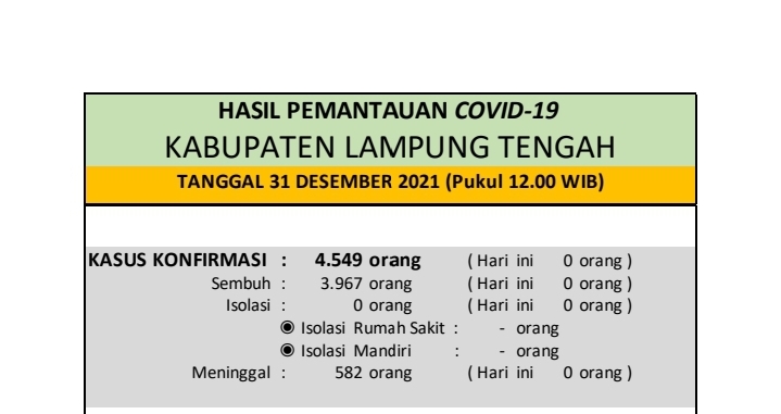 HASIL PEMANTAUAN COVID-19 KABUPATEN LAMPUNG TENGAH : Tanggal 31 Desember 2021 (Sampai dengan pukul 12.00 WIB)