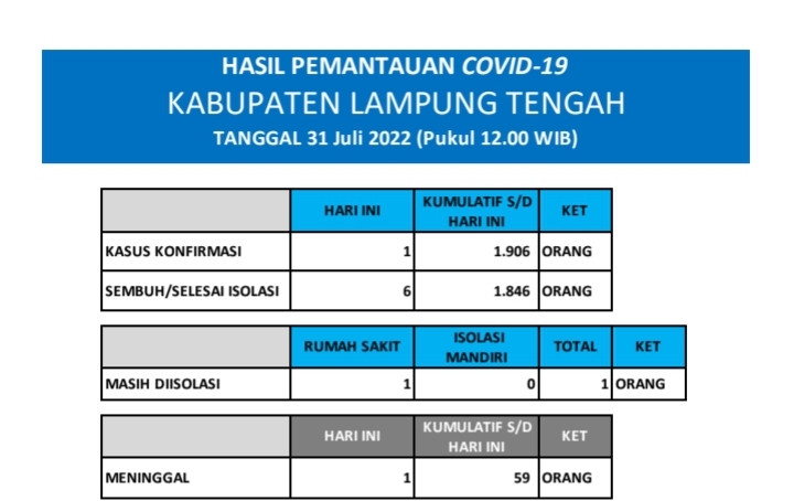 HASIL PEMANTAUAN COVID-19 KABUPATEN LAMPUNG TENGAH : Tanggal 31 Juli 2022