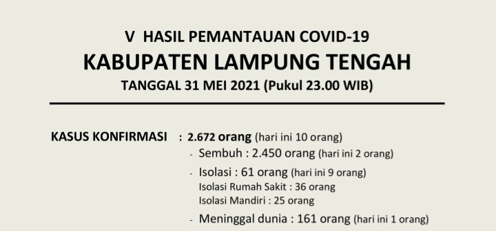 Download dokumen : HASIL PEMANTAUAN COVID-19 KABUPATEN LAMPUNG TENGAH : Tanggal 31 Mei 2021 Pukul 23.00 WIB