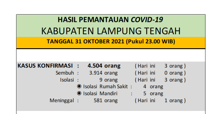 Download dokumen HASIL PEMANTAUAN COVID-19 KABUPATEN LAMPUNG TENGAH : Tanggal 31 Oktober 2021 Pukul 23.00 WIB