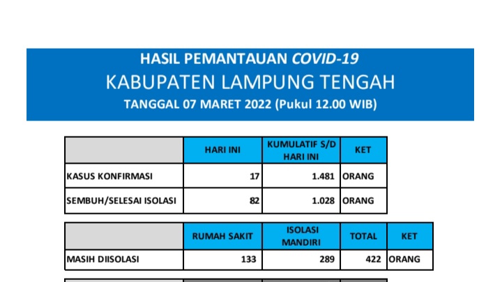 HASIL PEMANTAUAN COVID-19 KABUPATEN LAMPUNG TENGAH : Tanggal 7 Maret 2022
