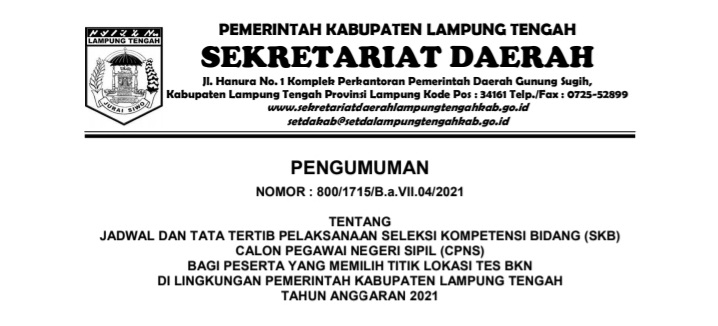 Jadwal dan Tata Tertib Pelaksanaan SKB CPNS Bagi Peserta Yang Memilih Tilok Tes BKN Di Lingkungan Pemkab Lampung Tengah TA 2021