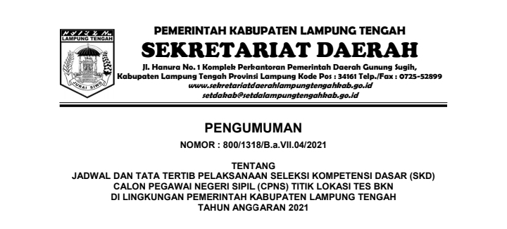 Download dokumen selengkapnya : PENGUMUMAN : JADWAL DAN TATA TERTIB PELAKSANAAN SKD CPNS TITIK LOKASI TES BKN DI LINGKUNGAN PEMKAB LAMPUNG TENGAH TA 2021 Lampiran Jadwal SKD Daftar Kanal Youtube CAT