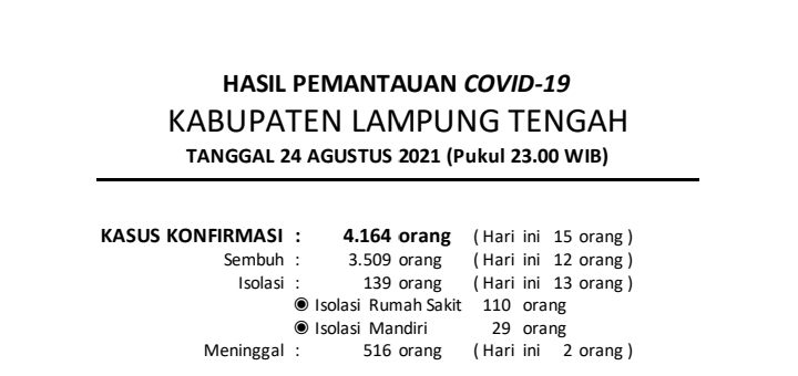 Download dokumen : HASIL PEMANTAUAN COVID-19 KABUPATEN LAMPUNG TENGAH : 24 AGUSTUS 2021 PUKUL 23.00 WIB