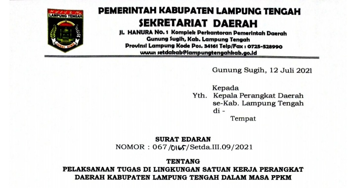 Download selengkapnya : PELAKSANAAN TUGAS DI LINGKUNGAN SATUAN KERJA PERANGKAT DAERAH KABUPATEN LAMPUNG TENGAH DALAM MASA PPKM