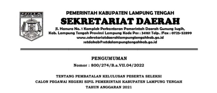 PEMBATALAN KELULUSAN PESERTA SELEKSI CALON PEGAWAI NEGERI SIPIL PEMERINTAH KABUPATEN LAMPUNG TENGAH TA 2021