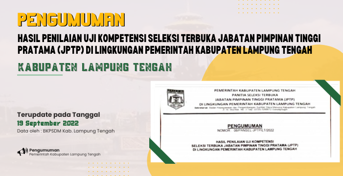 PENGUMUMAN 2022 - HASIL PENILAIAN UJI KOMPETENSI SELEKSI TERBUKA JABATAN PIMPINAN TINGGI PRATAMA (JPTP) DI LINGKUNGAN PEMERINTAH KABUPATEN LAMPUNG TENGAH