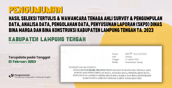 Pengumuman Hasil Seleksi Tertulis & Wawancara Tenaga Ahli Survey & Pengumpulan Data, Analisa Data, Pengolahan Data, Penyusunan Laporan (SKPD) Dinas Bina Marga dan Bina Konstruksi Kabupaten Lampung Tengah TA. 2023